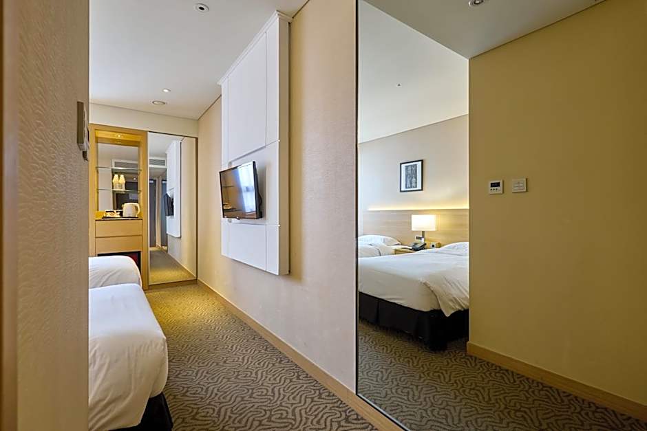 This room offers 1 double bed and 1 single bed. and fitted with a flat-screen TV, a fridge, an electric kettle and a bathtub.